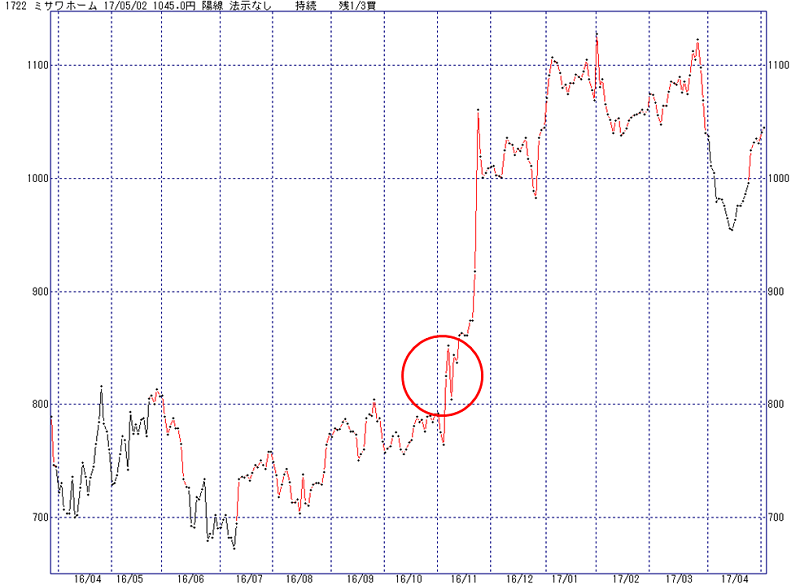 2016年11月9日の急落場面では、中源線で陰転した個別銘柄がたくさんあります。その中でテイクアンドギヴ・ニーズは、「陰転しなかった」「ガクンと下げたことを受けても“持続”と判断した」ということで、重要なのは「なにもしない」という明確な答えを出し、その通りに行動する理由もハッキリしていたということです。