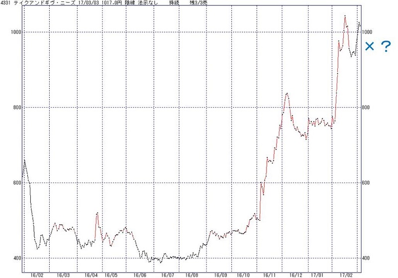 チャートは、4331テイクアンドギヴ・ニーズ、林投資研究所の助言サービス「中源線シグナル配信」において、パフォーマンスが良好かつ安定していると判断した「ユニバース」98銘柄の1つです。