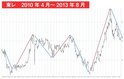 このチャートは東レ(3402)の日足(終値の折れ線チャート)、期間は2010年4月から2013年8月です。