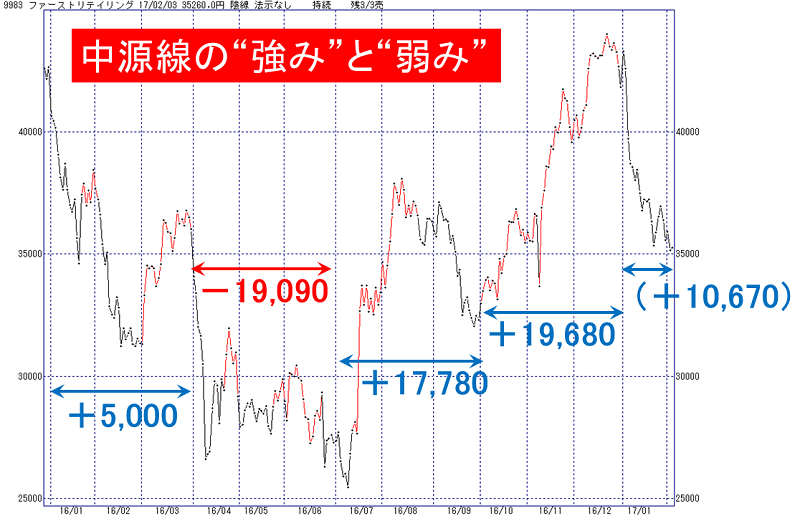 上のチャートは、番組でも紹介した、2月3日終値までの中源線(日足)です。