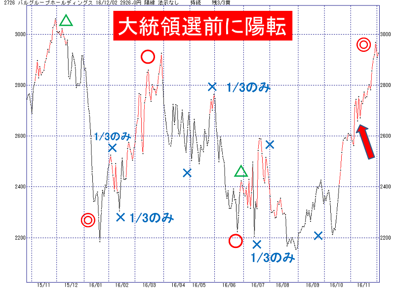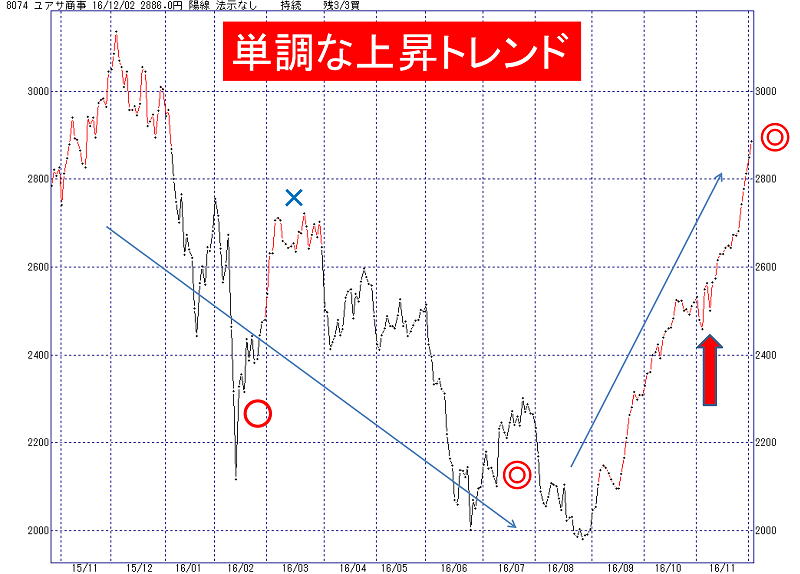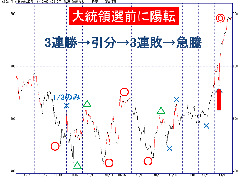 さて、この銘柄も「大統領選を境にあらゆる銘柄が上がったわけではない」という説明を裏付ける動きで、目先は10月12日の安値から上昇がスタートしています。そして、10月20日に陽転、そのまま上伸して上げの波に乗っています。