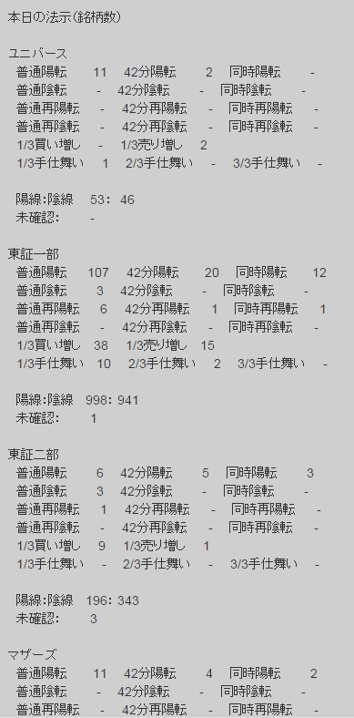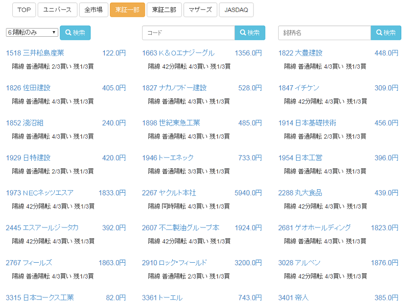 このように、当日大引での中源線の判断を全銘柄について掲載していますが、上の図は「本日陽転した銘柄」に絞った画面です。。