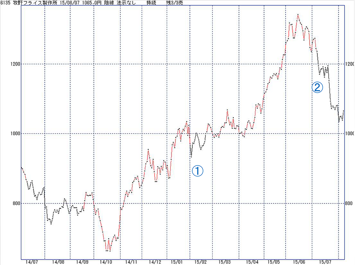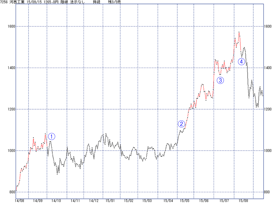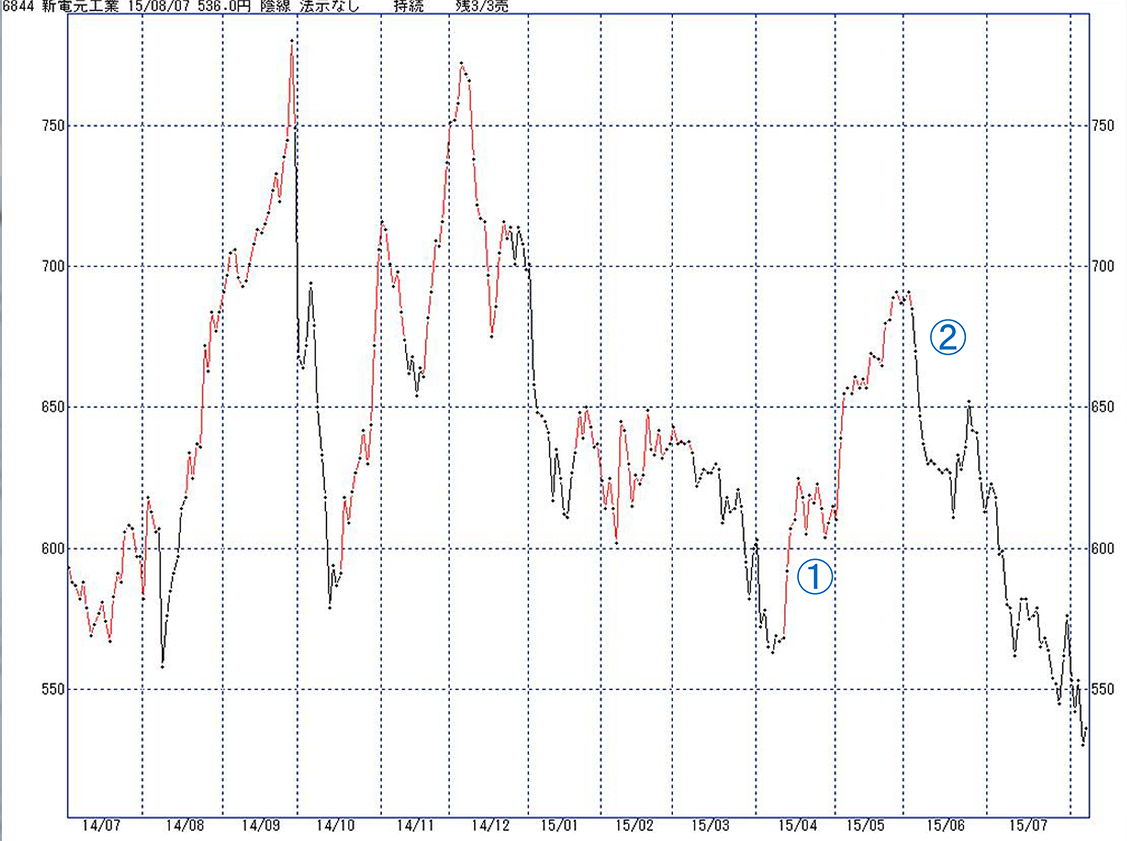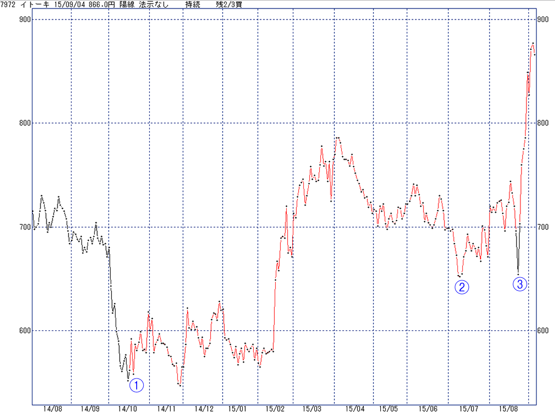 ところが番組の翌日、10月6日に再び陽転しています(4)。2015年後半の下げで400円前後まで下落したあと、2度目の陽転ということです。