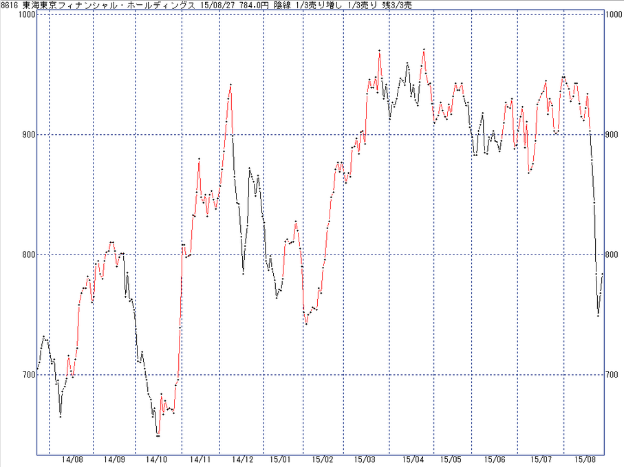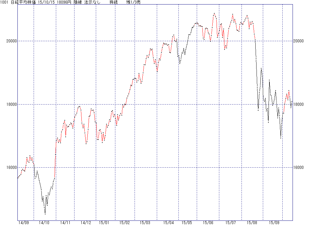 10月5日に陽転したところで、3分割の1単位、つまり「1/3」の建玉をして、その後の増し玉がないので、10月14日の陰転で投げたのは1単位にとどまりました。