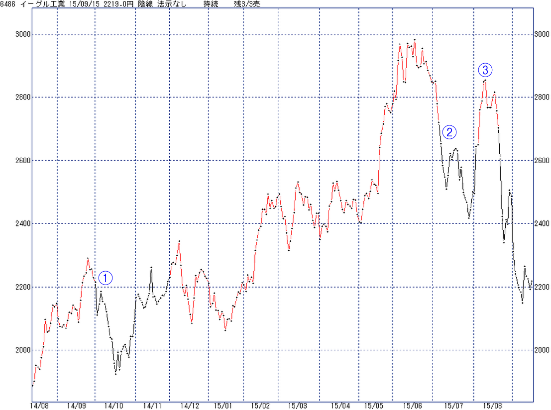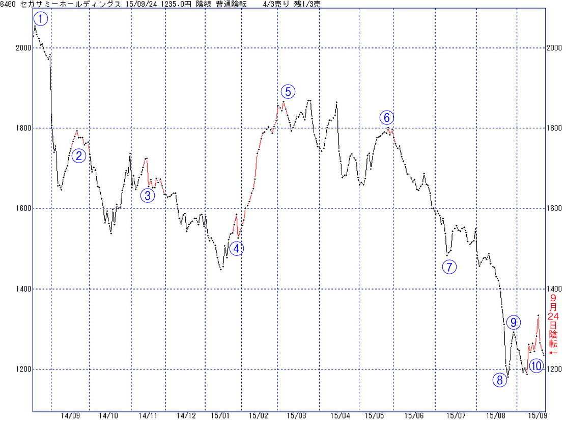 6月4日に陰転(1)したあと、ダラダラと下げています。9月9日に陽転(2)したところで、売りポジションが約100円幅の利食いとなりました。実に素直に取れています。しかし、9月の後半に弱含んだ結果、短い期間で陰転してしまいました(3)。この陰転は、9月18日です。番組で紹介したチャートは、この転換で陰線になった状態でした。