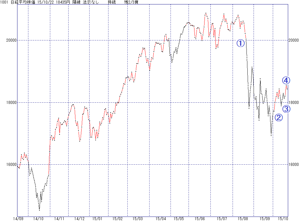 放送の当日、10月5日に陽転したのですが(2)、翌週10月14日の下げで陰転しました(3)。そこから切り返して強張った結果、10月21日の上げで再び陽転しています(4)。